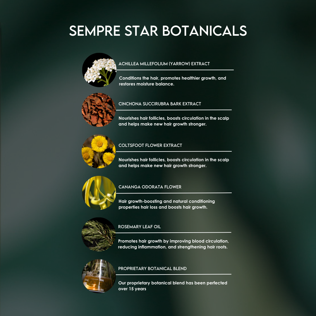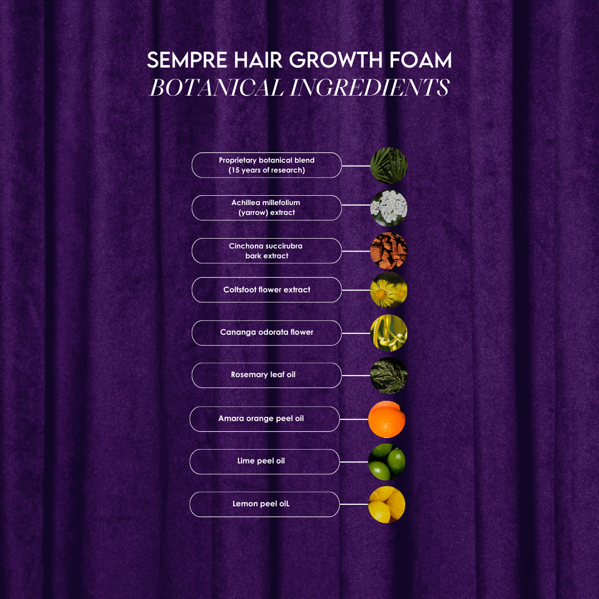 Sempre growth foam contains a medley of botanical extracts known to improve scalp and hair wellness. The proprietary growth formulation is a collective of organic compounds derived from over 20 years of research with demonstrated success in hair health.